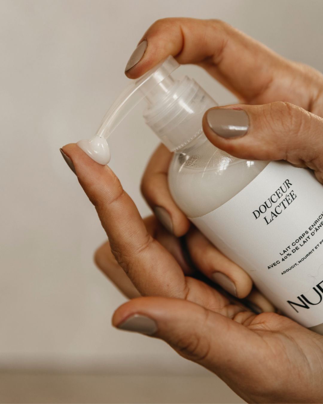 Le lait hydratant au lait d'ânesse : Quotidiennement, sur le corps comme sur le visage, une noisette suffit ! Appliquer en massant et plongez vous dans un bain de douceur